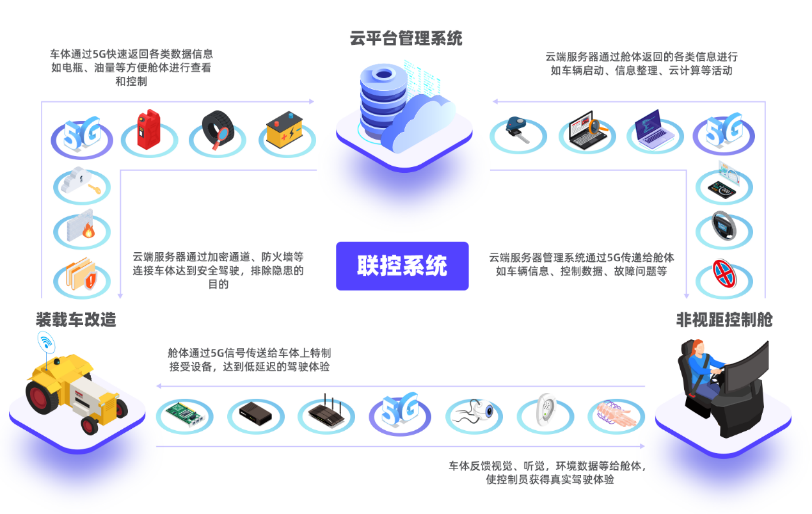 远程驾驶系统利用物联感知技术、人工智能技术、大数据技术、云技术、云计算、5G通信技术等新型数字技术,基于远程作业场景,以车端控制系统为数据采集源及指令执行端,5G通信技术为数据传输方式,人工智能为智能驾驶助力器,云平台管理系统为控制中心和决策中心的架构,实现车辆的远程驾驶及远程控制的目的。